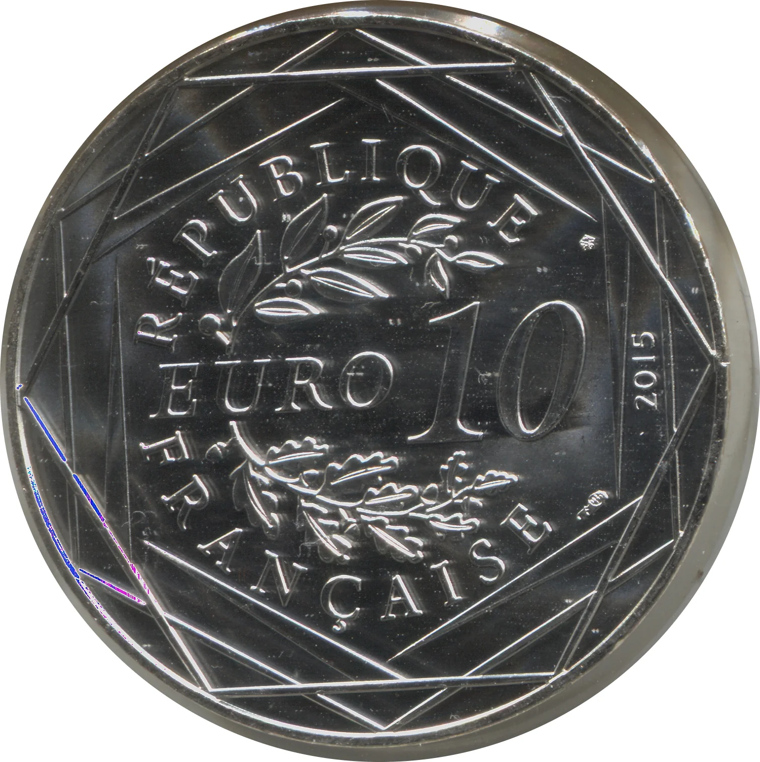 Face value "10 EURO" between laurel and oak branches, surrounded by "RÉPUBLIQUE FRANÇAISE", three hexagons, and the year. To the right, a cornucopia below and a pentagon above the "10".