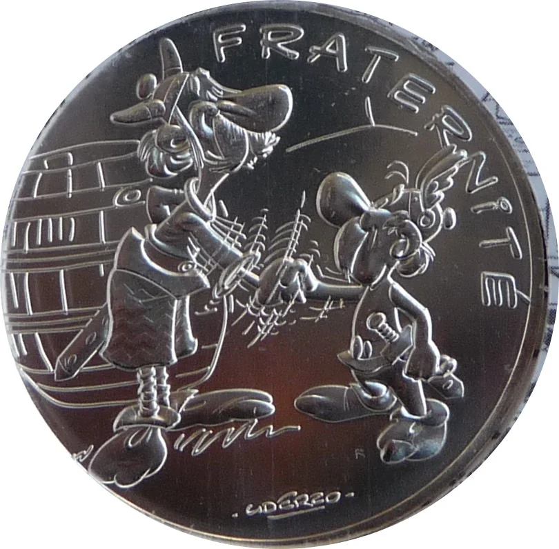 "10 EURO" between laurel and oak branches, encircled by "RÉPUBLIQUE FRANÇAISE", three hexagons, and the year. To the right of the 10, a cornucopia below and a pentagon above.