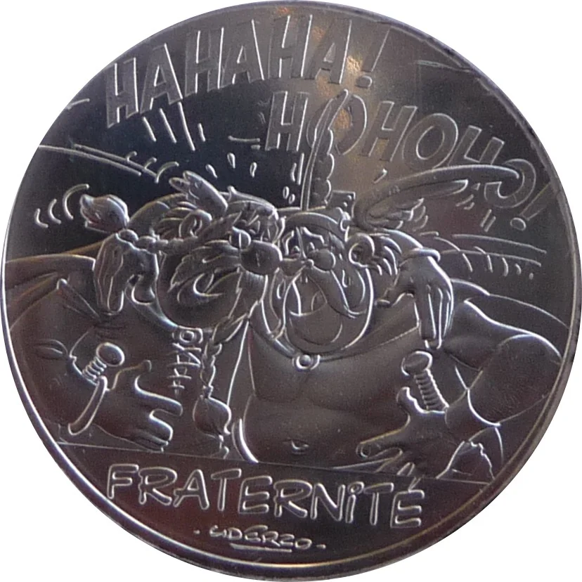 "10 EURO" between laurel and oak branches, encircled by "RÉPUBLIQUE FRANÇAISE", three hexagons, and the year. To the right of the 10, a cornucopia below and a pentagon above.