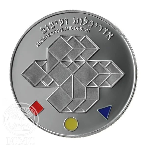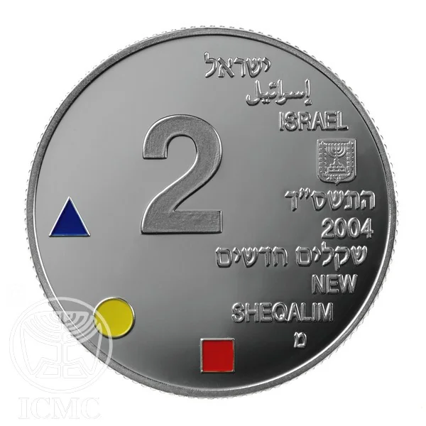 Israeli state emblem with face value in Hebrew and English. "Israel" appears in English, Hebrew, and Arabic. Mint year and three geometric shapes—a blue triangle, yellow circle, and red square—are along the lower border.