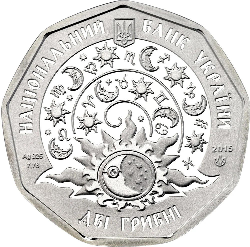 The obverse features Ukraine's Small Coat of Arms with the inscription "НАЦІОНАЛЬНИЙ БАНК УКРАЇНИ." Below is the face value "ДВІ ГРИВНІ" under a stylized celestial scene with Zodiac signs, the Moon, and Sun. The year 2015 and the Mint mark are on the right; the metal specification Ag 925/7,78 is on the left.