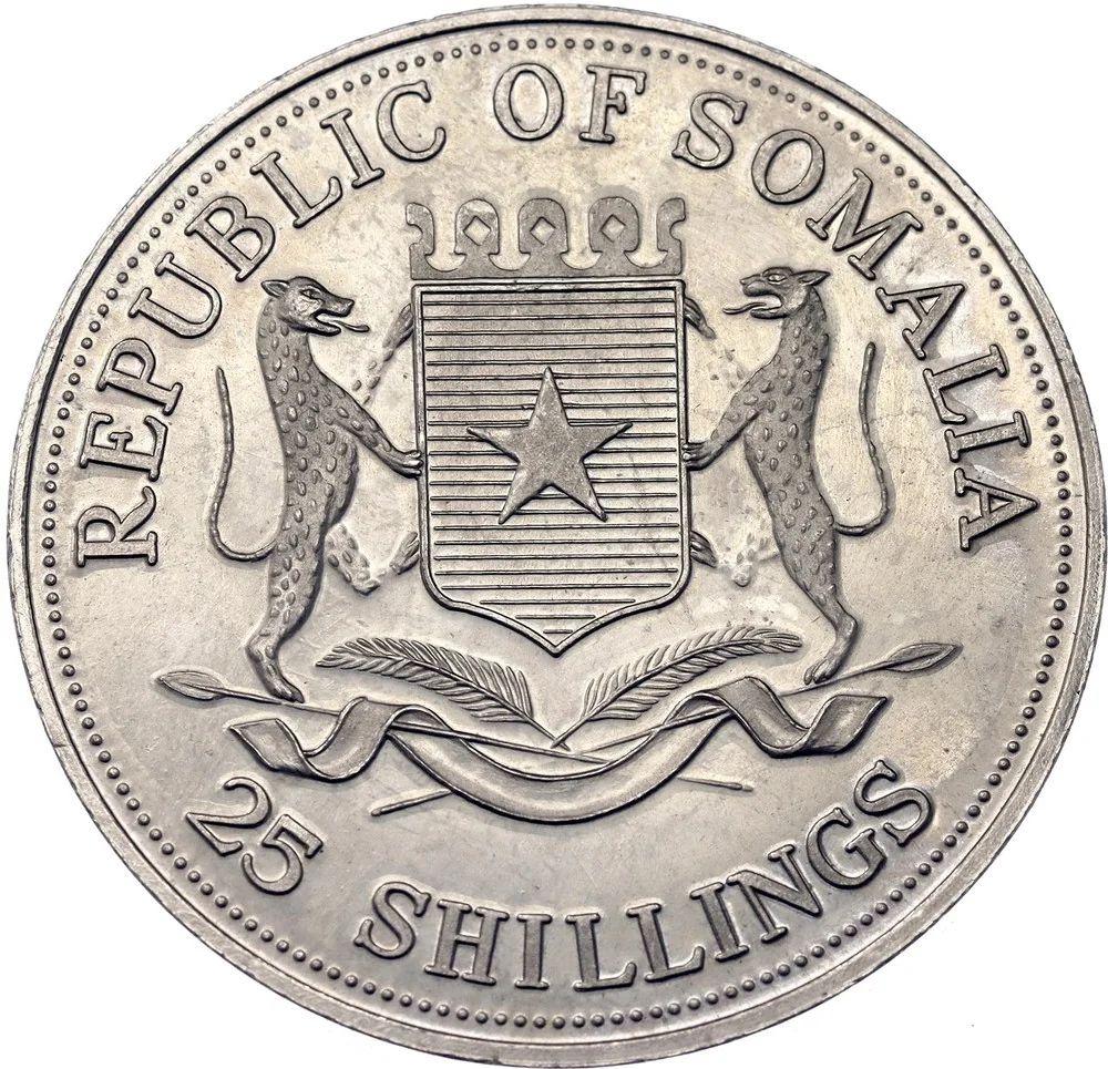 Somalia's coat of arms is centered, with "REPUBLIC OF SOMALIA" above and "25 SHILLINGS" below. The edge is dotted.