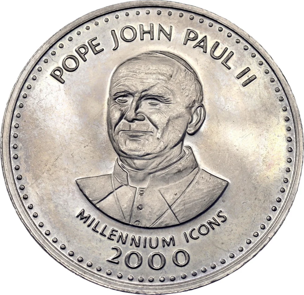 The coin's center features Pope John Paul II, with "POPE JOHN PAUL II" above and "MILLENNIUM ICONS" below. The year "2000" is at the bottom edge, which is encircled by 81 dots.