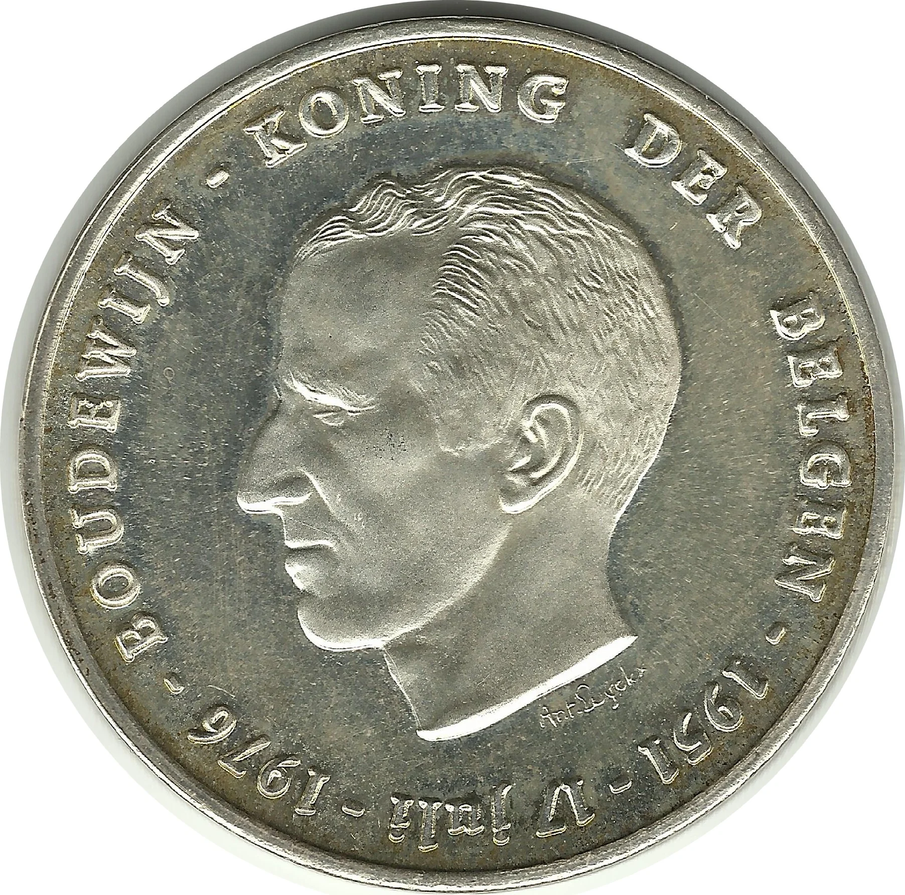 King Baudouin left profile, Dutch text encircling, designer below.