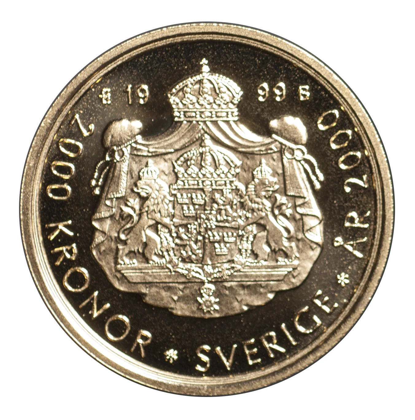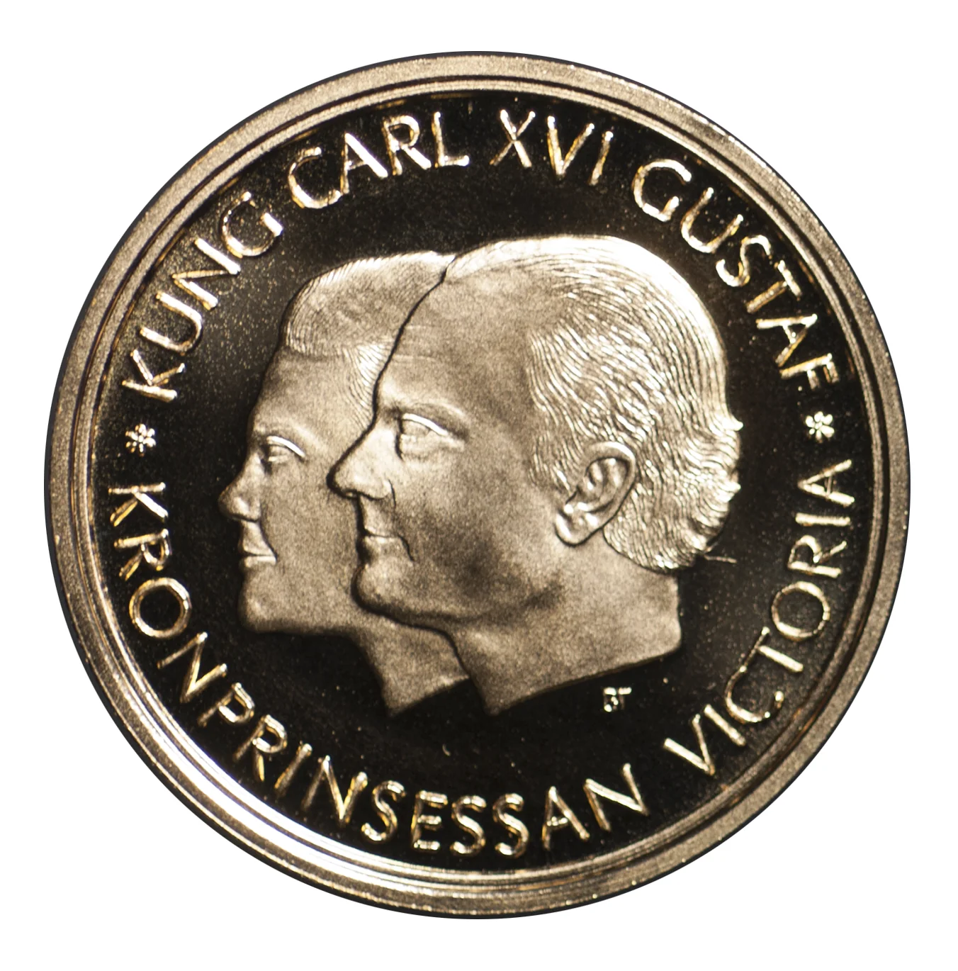 Conjoined left-facing heads of King Carl XIV Gustaf and Crown Princess Victoria.