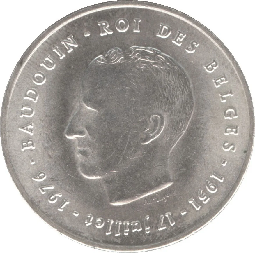 King Baudouin left-facing portrait with French text encircling, designer's name below.