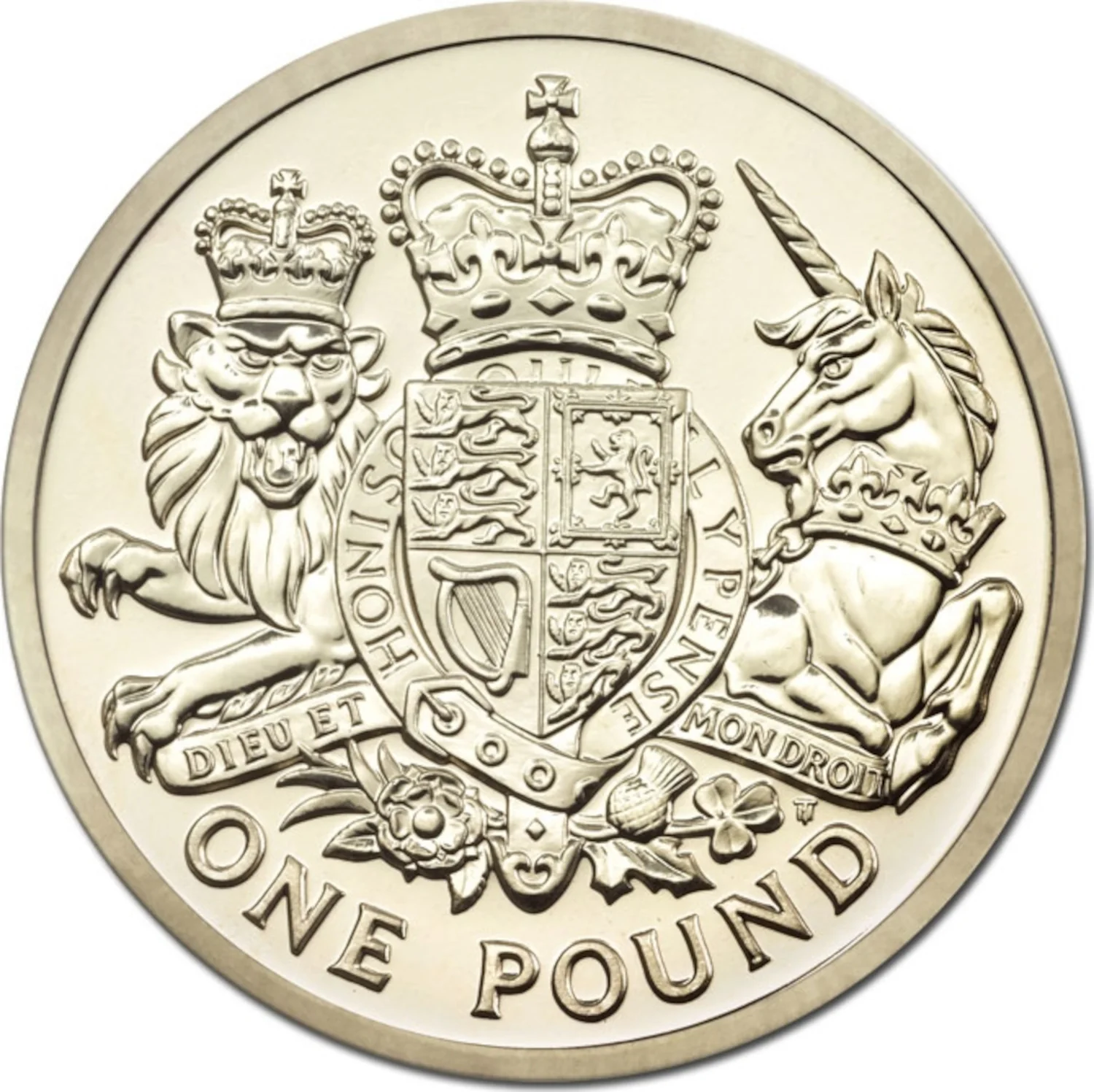 A crowned, quartered shield supported by a crowned English lion and a Scottish unicorn, above the rose, thistle, shamrock and leek.