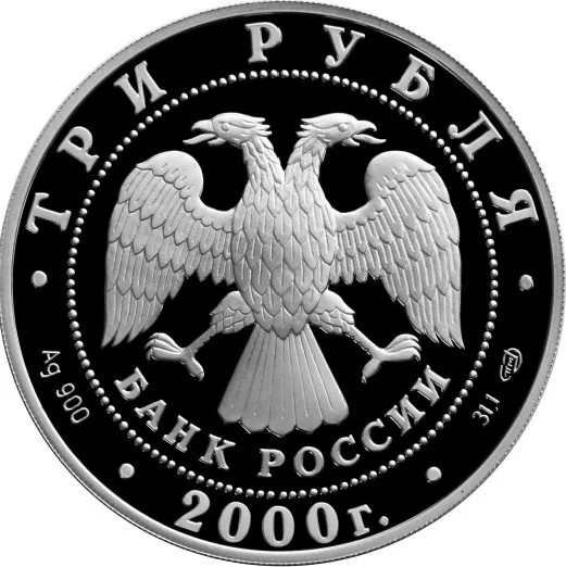 Center: Bank of Russia emblem (I. Bilibin's two-headed eagle) above "БАНК РОССИИ". Around the rim: top - "ТРИ РУБЛЯ", bottom - "2000", left - metal/fineness, right - metal content/mint mark.