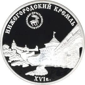 The Nizhny Novgorod Kremlin's walls and towers, topped by the 16th-century city seal depicting a deer and the inscription "Seal of Nizhny Novgorod Land." The rim reads "The Nizhny Novgorod Kremlin" and "XVI century."