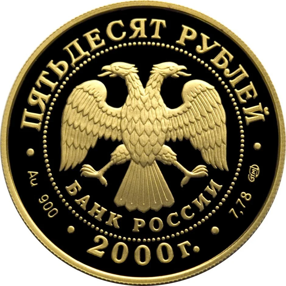 Center: The Bank of Russia emblem (I. Bilibin's two-headed eagle) above a semicircular "БАНК РОССИИ" inscription, encircled by dots. The rim inscriptions: top - "ПЯТЬДЕСЯТ РУБЛЕЙ", bottom - "2000". Left of the eagle: metal and alloy mark. Right: fine metal content and mint mark.