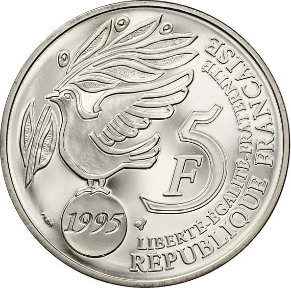 A dove on a globe with an olive branch symbolizes world peace. It features the face value, year, and the republican motto.