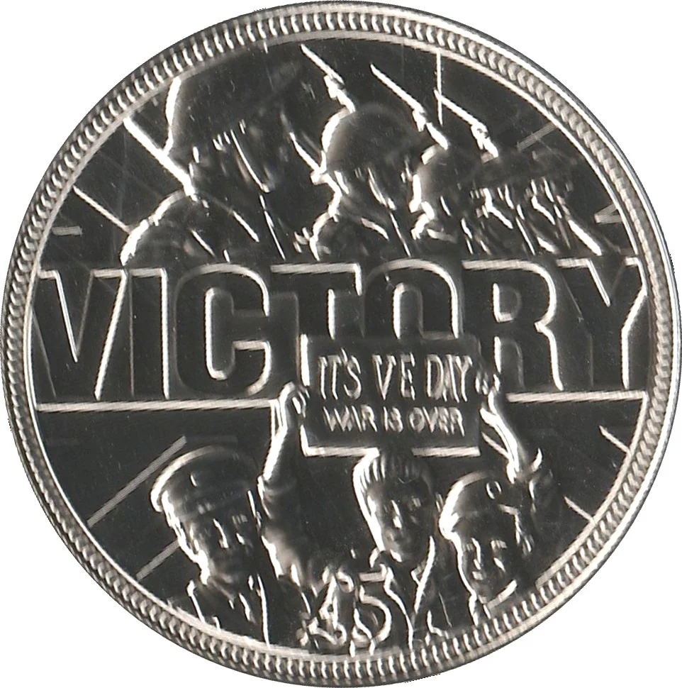 Union Jack with "VICTORY" across it. Soldiers return holding a sign: "It's VE Day, War is Over."
