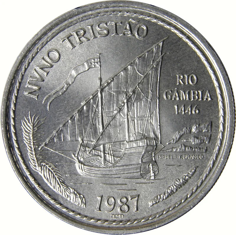 A caravel with lateen sails, like those used by Nuno Tristão on his voyages for Henry the Navigator. He reached the Gambia River in 1446 on his final expedition. Date of coin below.