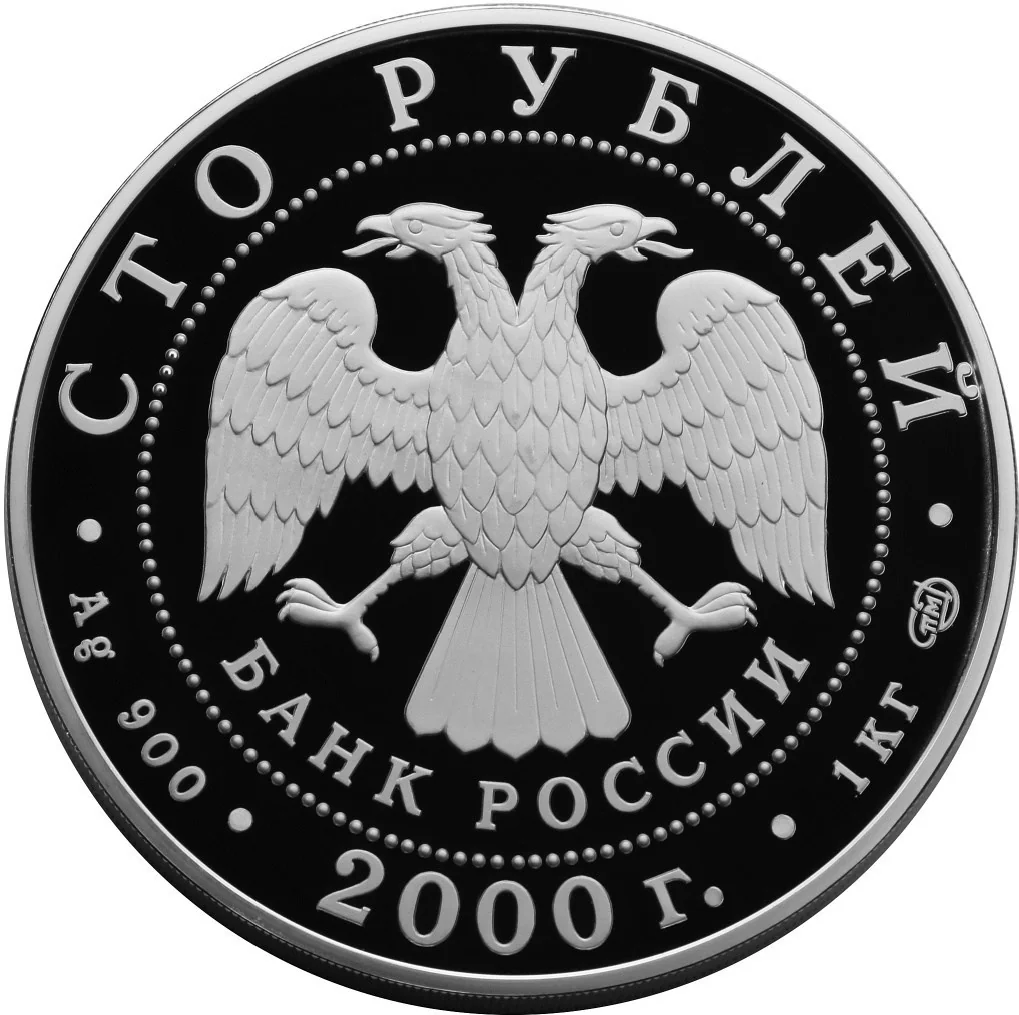 Center: Bank of Russia emblem (I. Bilibin's two-headed eagle) above "БАНК РОССИИ", circled by dots. Rim inscriptions: top - "СТО РУБЛЕЙ", bottom - "2000". Left: metal/fineness. Right: metal content/mint mark.