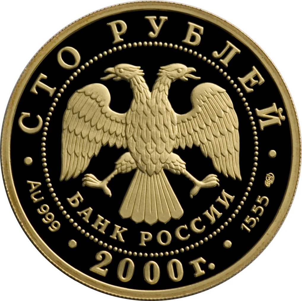 Centered is the Bank of Russia emblem (I. Bilibin's two-headed eagle) above "БАНК РОССИИ", encircled by dots. The rim inscriptions: top - "СТО РУБЛЕЙ", bottom - "2000". Left letters indicate metal and fineness, right - metal content and mint mark.