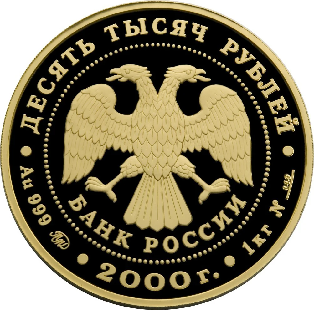 Center: The Bank of Russia emblem (two-headed eagle with wings down, over the inscription "БАНК РОССИИ") within a dotted circle. Above: "ДЕСЯТЬ ТЫСЯЧ РУБЛЕЙ". Below left: Metal, fineness, and mint mark; center: year "2000 г."; right: Fine metal content and serial number №___.