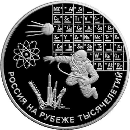 An astronaut floats in space, surrounded by: the first satellite (top left), an atom model (below it), a launching rocket (bottom), and the Periodic Table (top right). The rim inscription reads: "РОССИЯ НА РУБЕЖЕ ТЫСЯЧЕЛЕТИЙ".