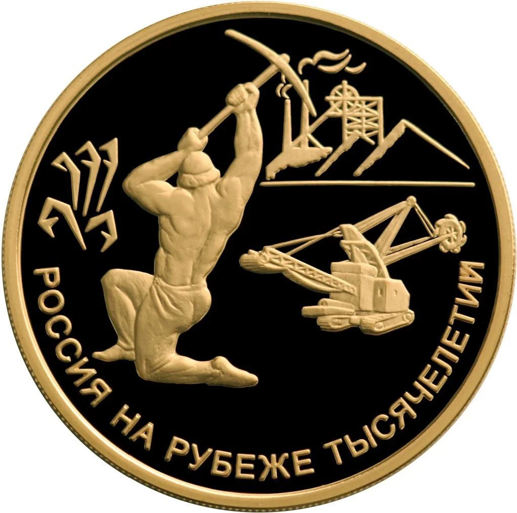 A miner raises a pickaxe overhead. To his left are rock crystals, to his right a mining excavator, and above them, a mine with spoil tips. The rim inscription reads: "РОССИЯ НА РУБЕЖЕ ТЫСЯЧЕЛЕТИЙ".