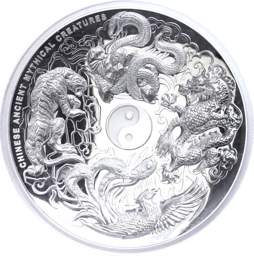 Four mythical Chinese beasts encircling a Yin Yang symbol.