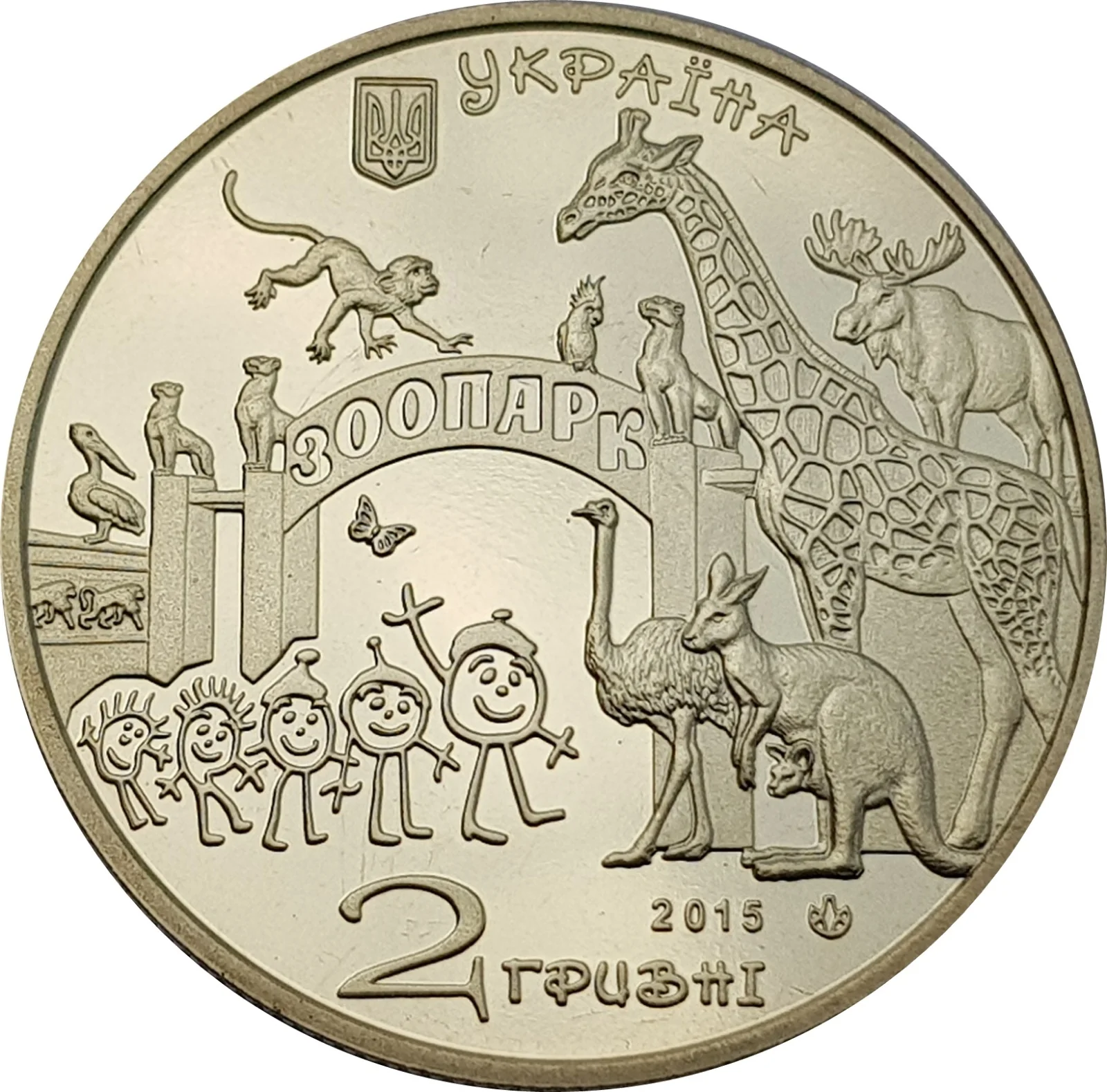 The coin's obverse features Ukraine's small coat of arms with the inscription "УКРАЇНА." It depicts stylized zoo animals greeting young visitors. Below are the year 2015, the face value "2 ГРИВНІ," and the Mint mark.