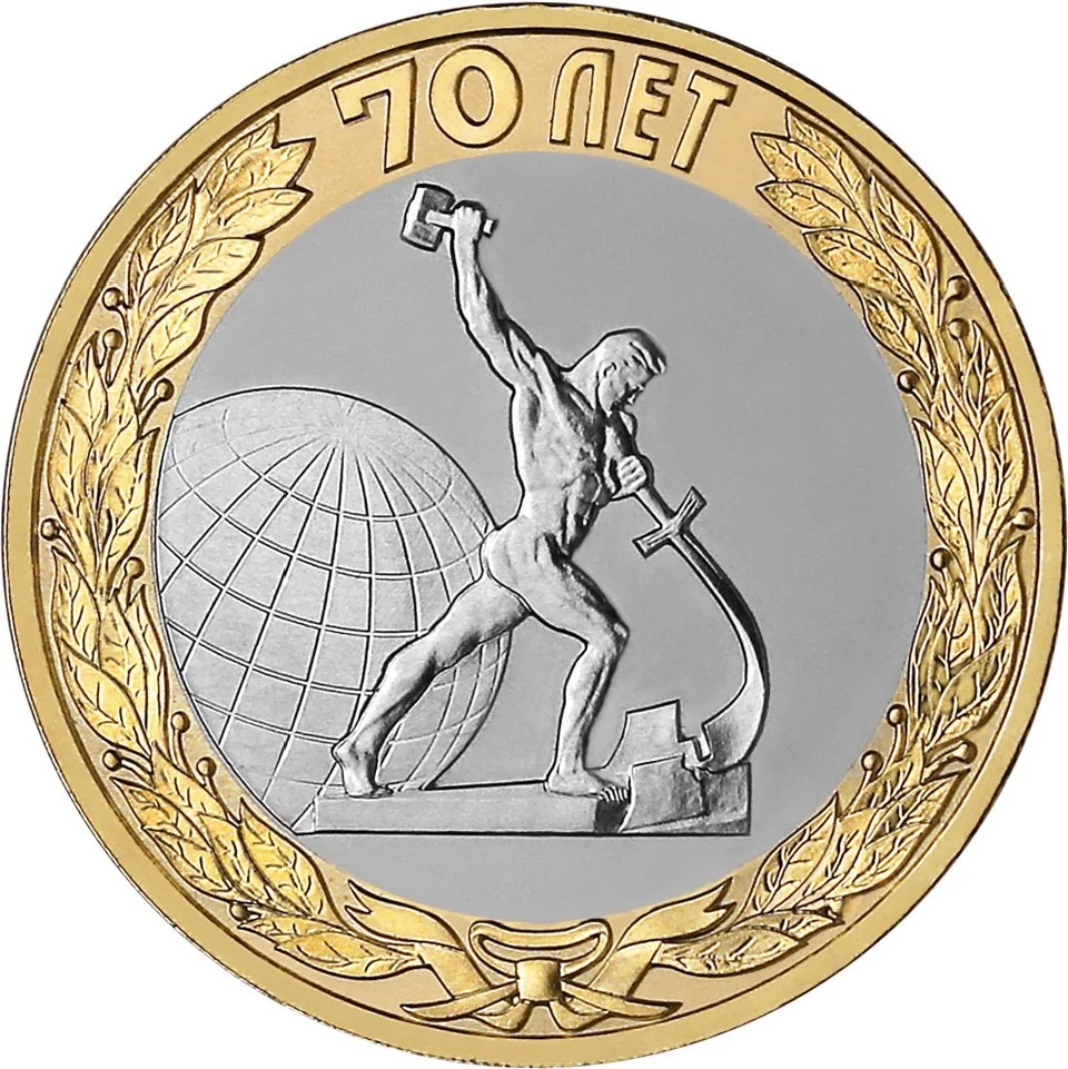 Obverse: Vuchetich's "Let’s Beat Swords into Ploughshares" sculpture with a globe outline. The rim bears a laurel wreath and the inscription "70 ЛЕТ".
