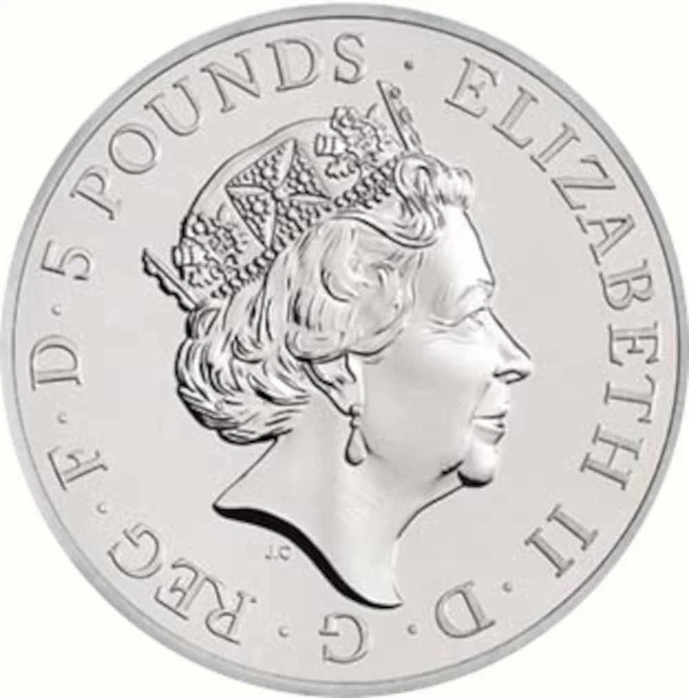 Elizabeth II, by the Grace of God, Queen, Defender of the Faith, 5 Pounds.