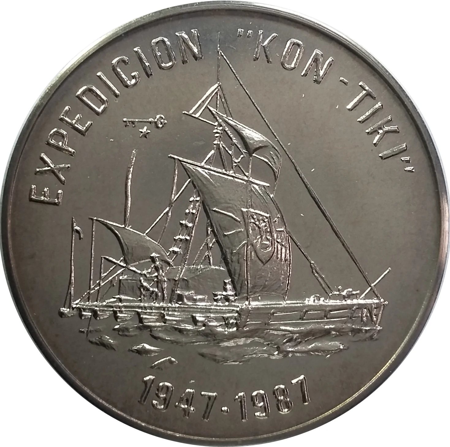 "Kon-Tiki" raft image with curved legend above, dates below. Key and star mintmarks between legend and image.