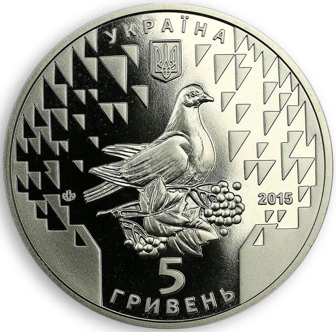 The semicircular inscription "УКРАЇНА" (UKRAINE) is above the Small Coat of Arms and a symbolic family tree with a bird in a viburnum nest. To the right is the year 2015, below is the face value 5 ГРИВЕНЬ, and to the left is the Mint mark of the National Bank of Ukraine.