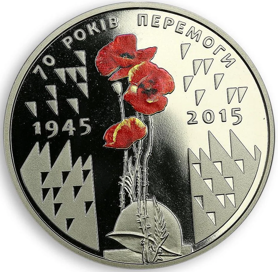 A soldier's helmet and red poppies for remembrance. Flanking dates 1945 and 2015. Above, triangles like candle flames under a semicircular inscription.