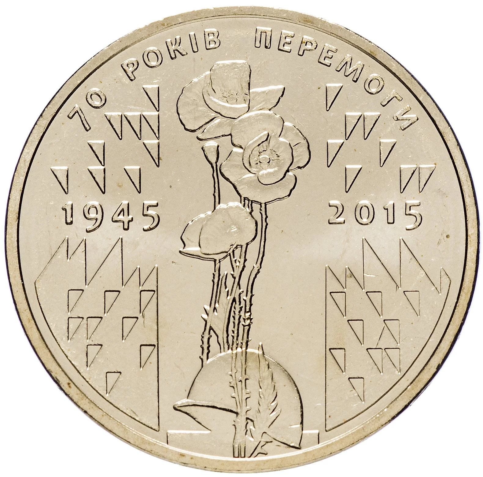 Helmet and poppy (tampon-printed) flank the dates 1945 and 2015. Above, a flame-triangle and "70 years of victory."