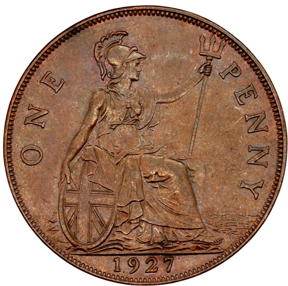 Britannia seated right, holding trident and Union Jack shield, with sea, denomination, and date.