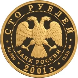Center: The Bank of Russia emblem (a two-headed eagle with wings down, with "BANK OF RUSSIA" below). It is surrounded by a dotted circle and rim inscriptions: top — "ONE HUNDRED ROUBLES", bottom — the year "2001". Left — metal and fineness; right — fine metal content and mint mark.