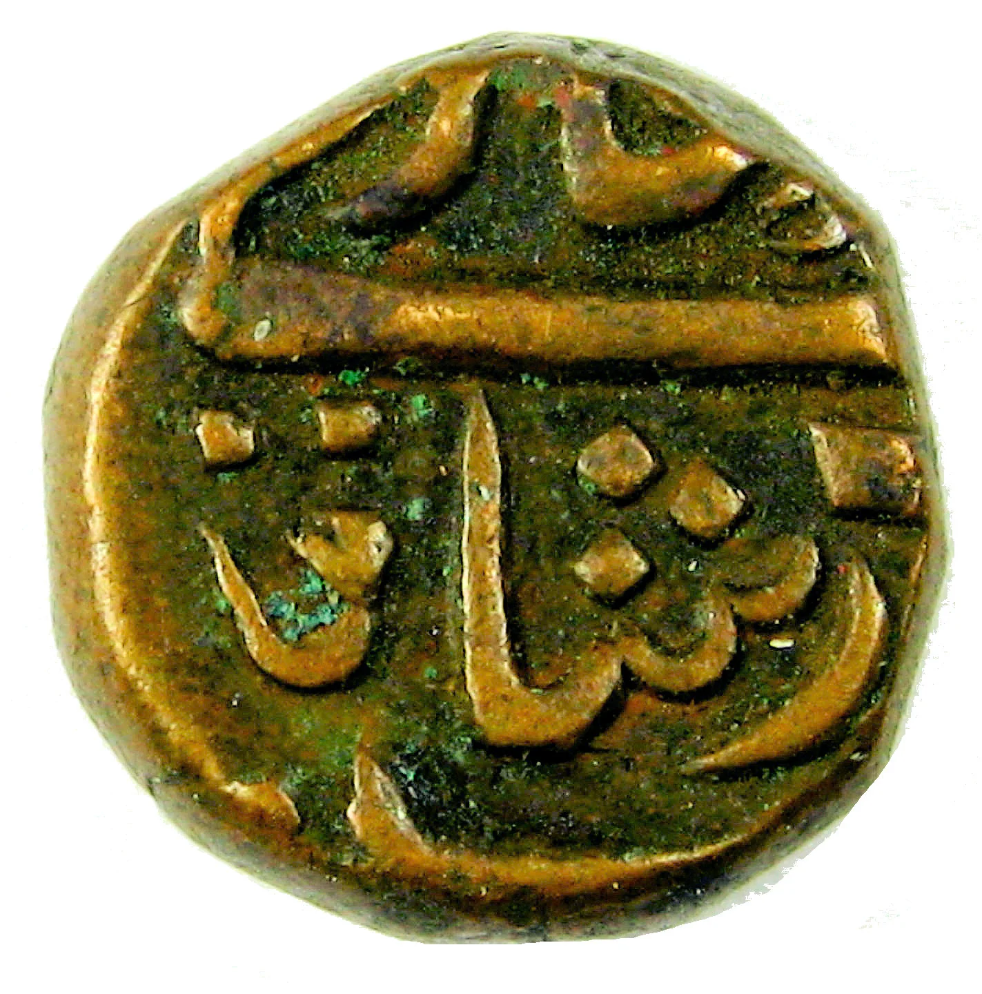Trisul (trident) and Katar (dagger), mint "Bhuj" in Urdu, ruler's name in Devnagari. Some coins lack the dagger.