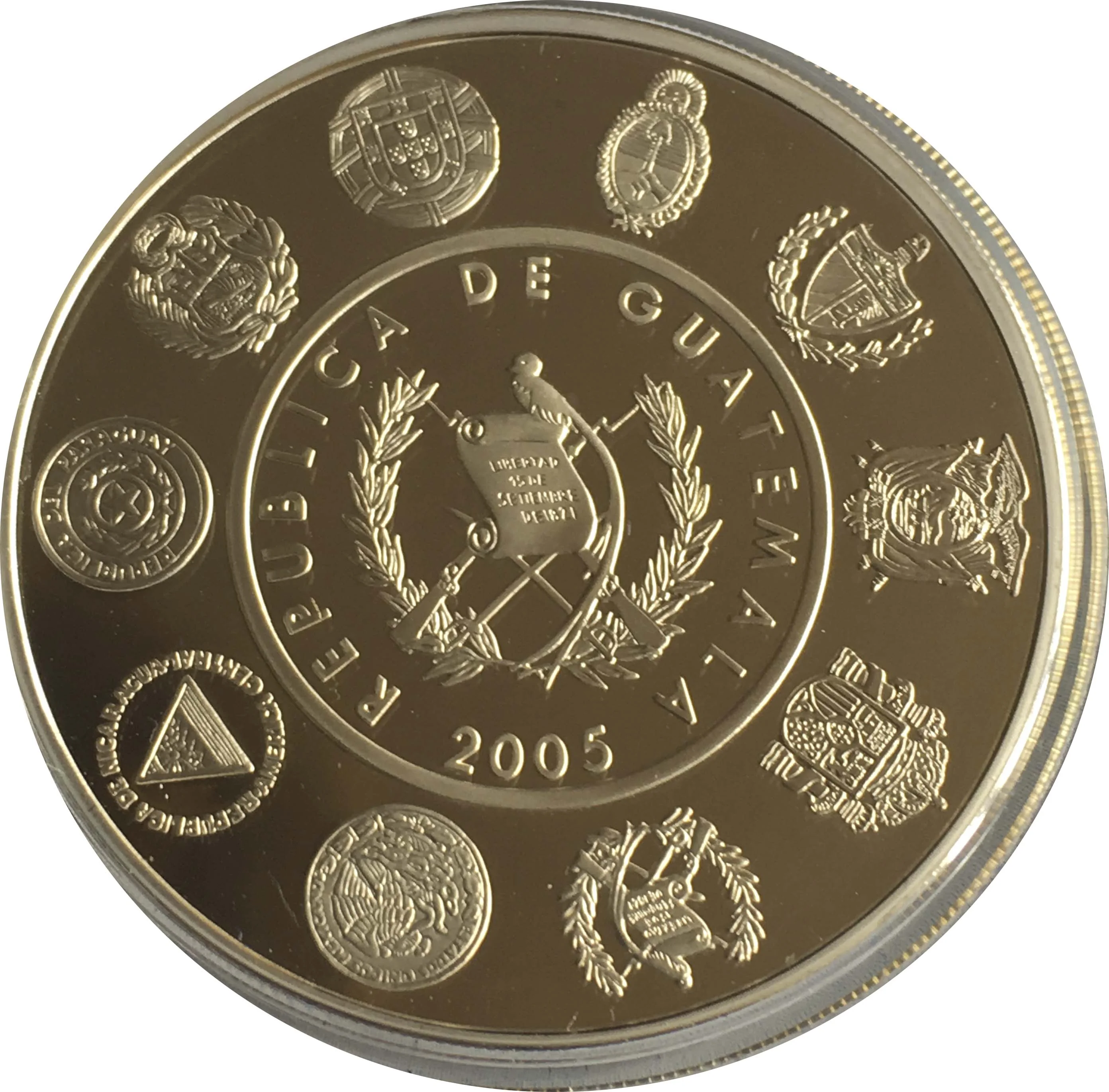 Description: Guatemala's arms with date below, surrounded by all other minting countries for this 6th series.