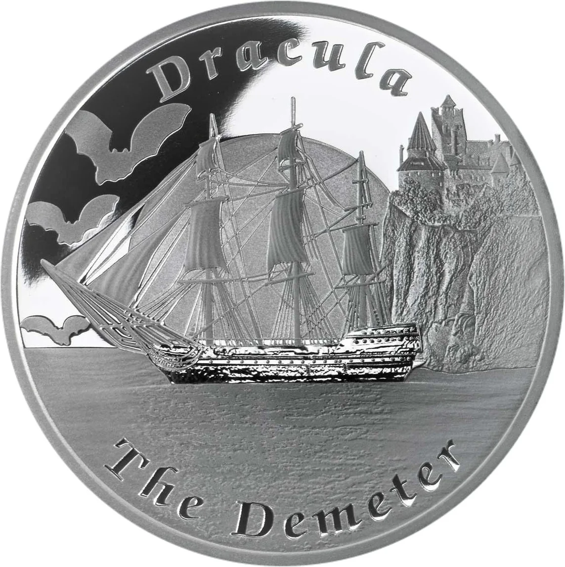 The Demeter sailing toward Whitby Abbey, bathed in moonlight and surrounded by bats.