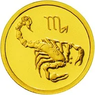 A scorpion against a starry background, topped by the Scorpio zodiac symbol.