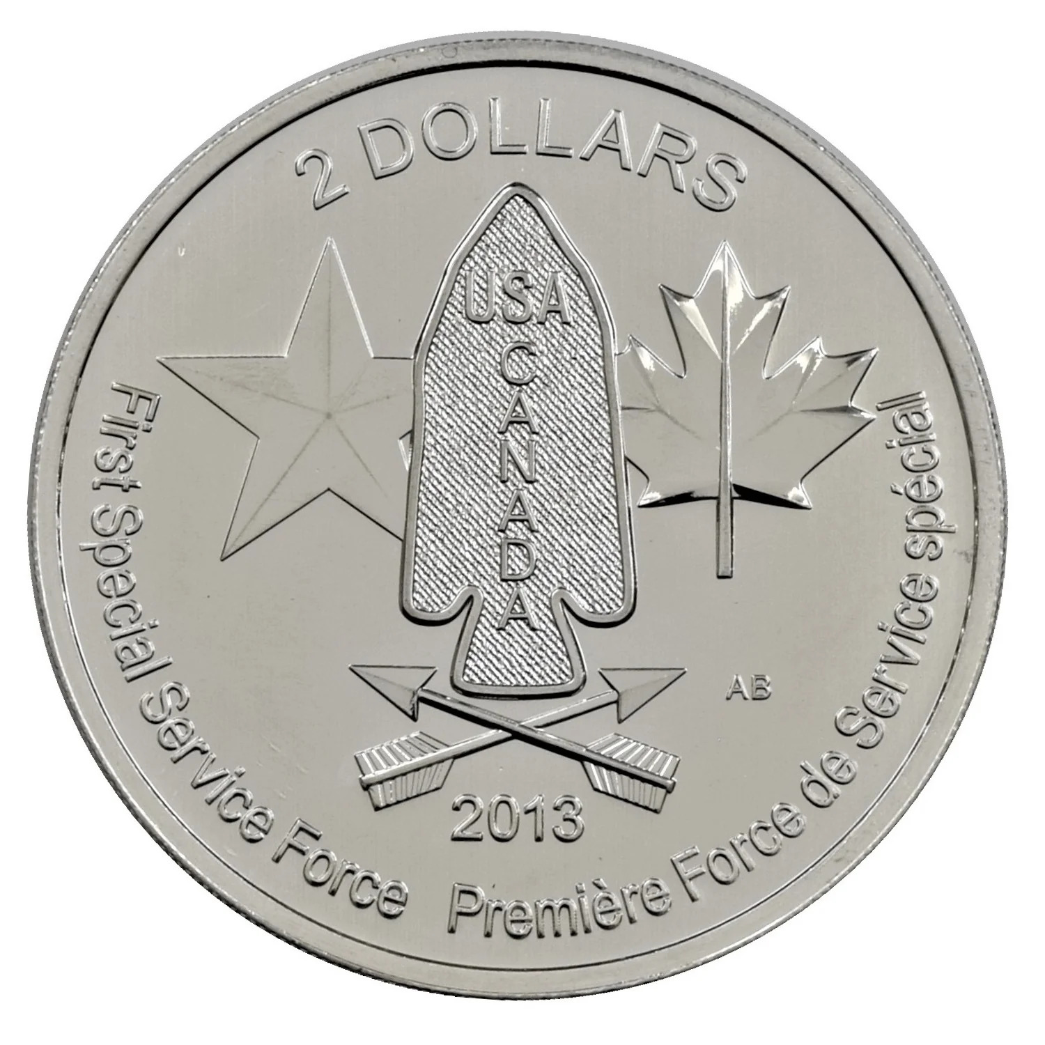 Central First Special Service Force patch flanked by a U.S. star and Canadian maple leaf, over crossed arrows and the year. Denomination above, unit name in English and French below.