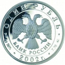 Center: Bank of Russia emblem (two-headed eagle, wings down, with "БАНК РОССИИ" below), within a dotted circle. Rim inscriptions: top - "ОДИН РУБЛЬ", bottom - "2002". Left: metal/fineness mark. Right: fine metal content and mint mark.