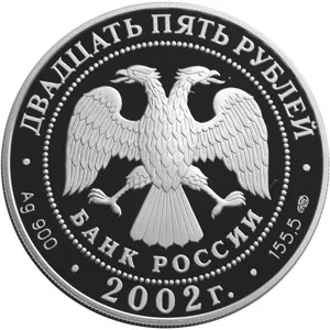 Central: Bank of Russia emblem (two-headed eagle, wings down, with "БАНК РОССИИ" below), within a dotted circle. Rim inscriptions: top - "ДВАДЦАТЬ ПЯТЬ РУБЛЕЙ", bottom - "2002". Left: metal/fineness mark. Right: fine metal content and mint mark.