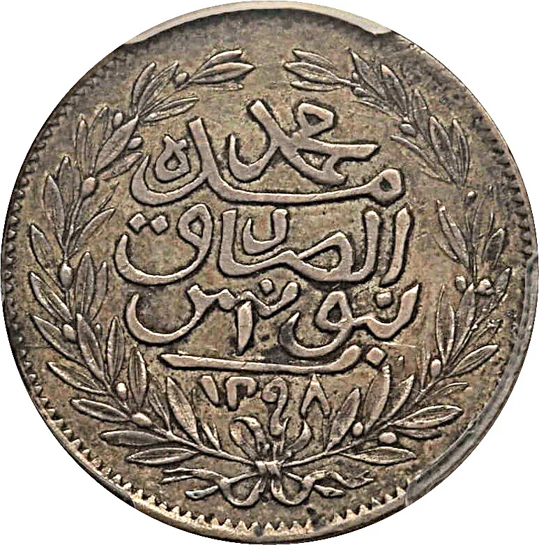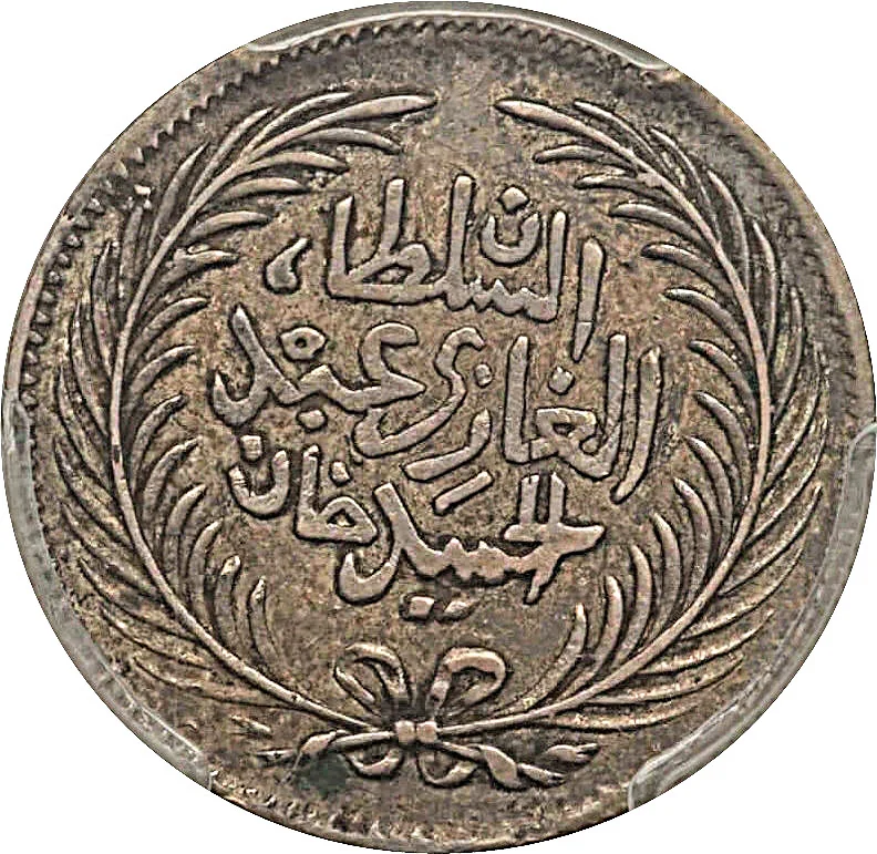 Bey, mint, year, and Hijri date encircled by wreath.