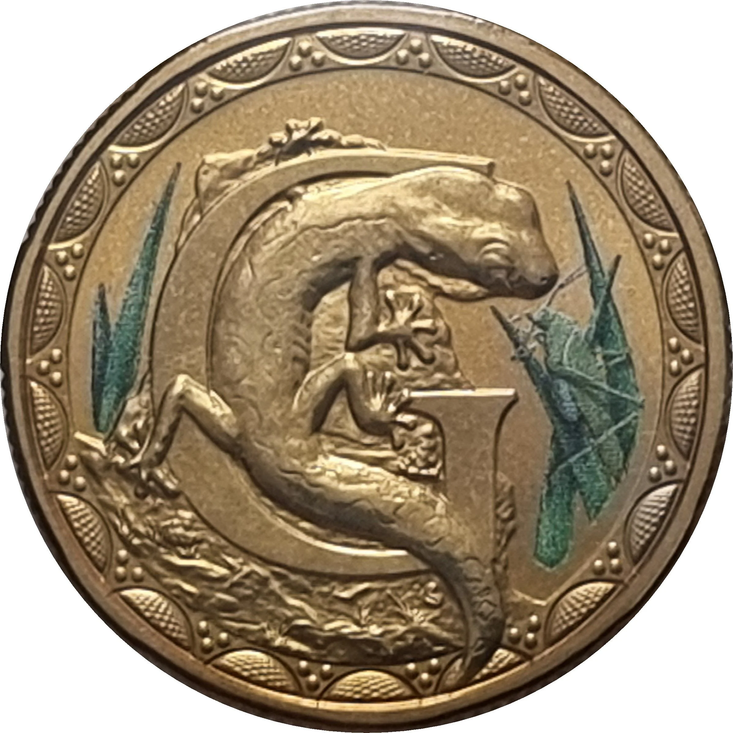 The gregarious Gecko playfully interacts with the letter G on this coin.
