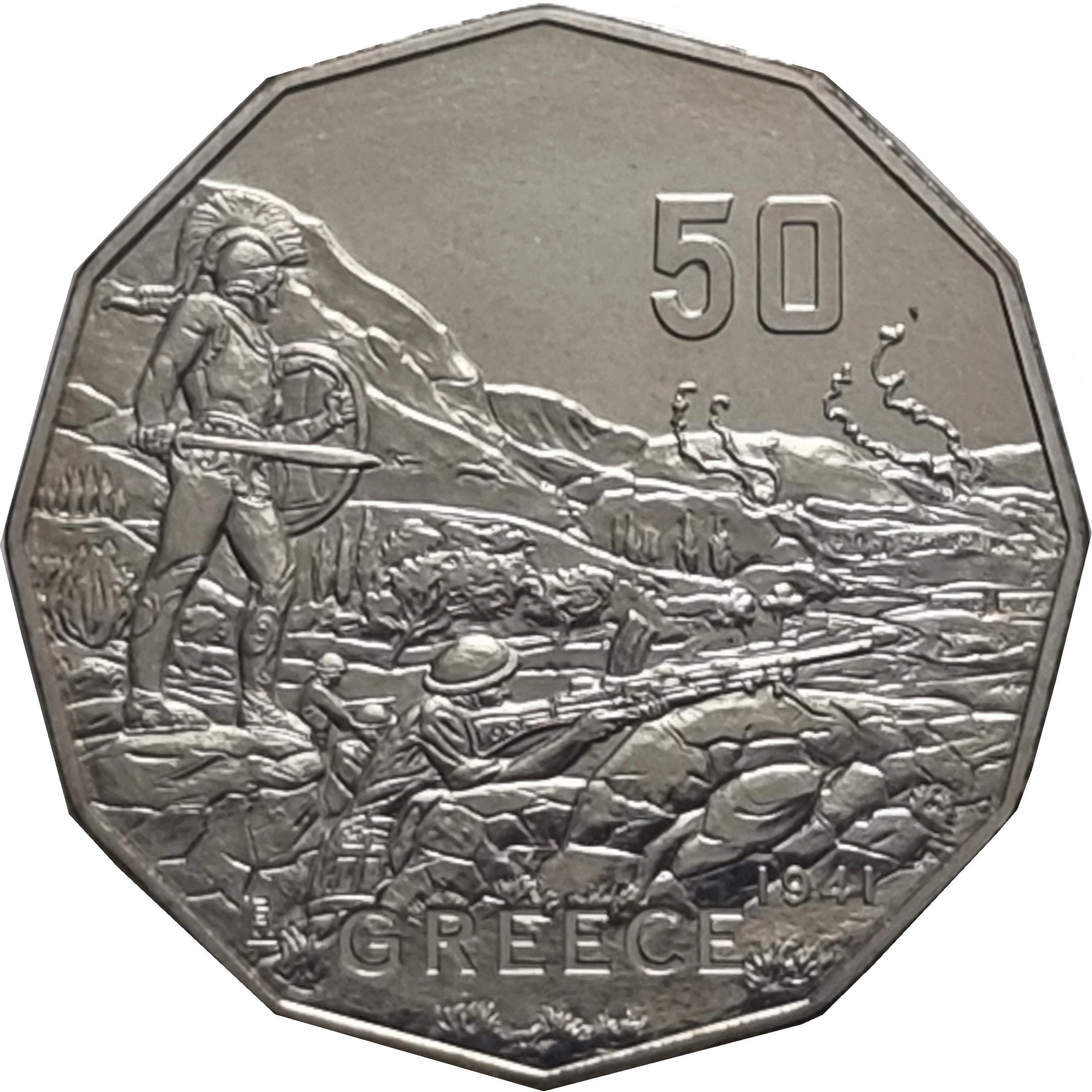 An Australian soldier fires a machine gun in a trench, with an ancient Greek soldier standing behind him, armed with a sword and shield.