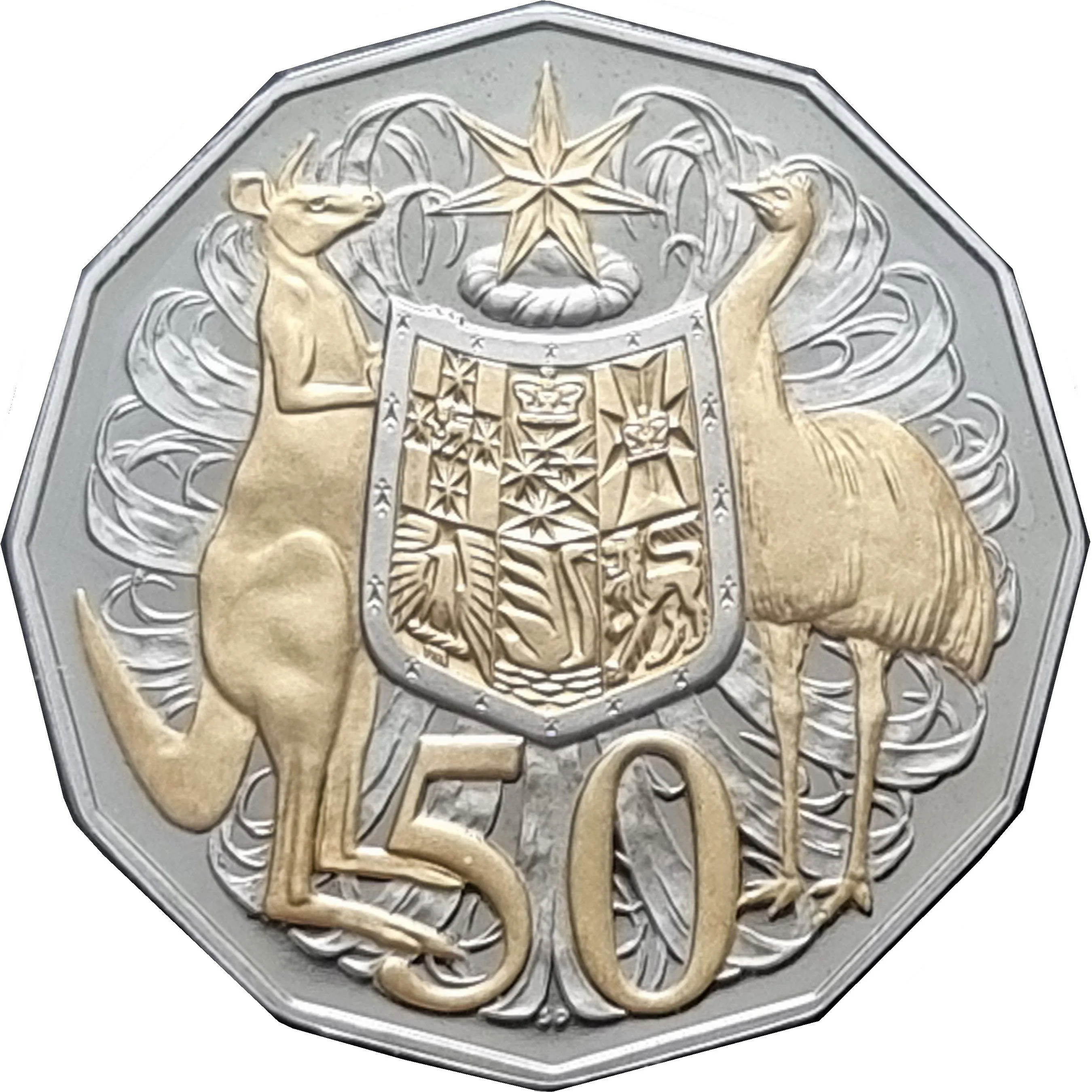 Australia's coat of arms, featuring a kangaroo and emu supporting a shield with a seven-pointed star, and the numeral "50," with these elements selectively gold-plated.