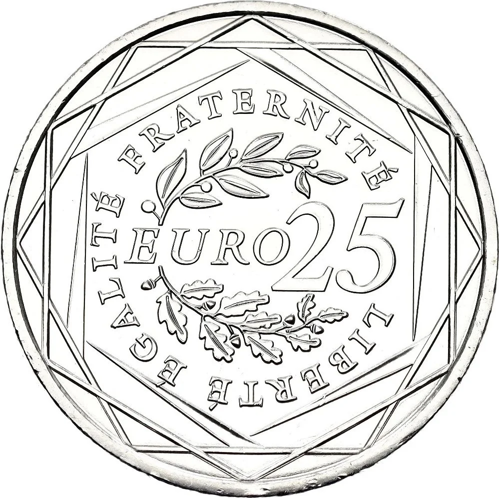 A laurel and oak branch frame the face value, encircled by the French motto and three hexagons.