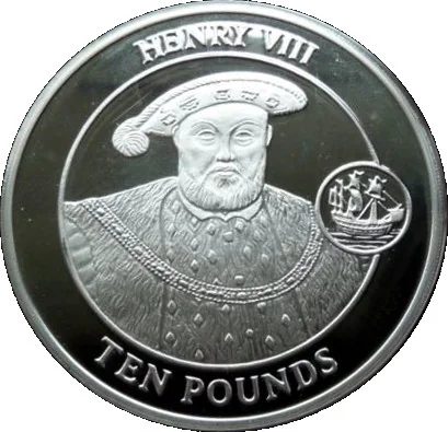 King Henry VIII portrait with Mary Rose cameo and denomination.