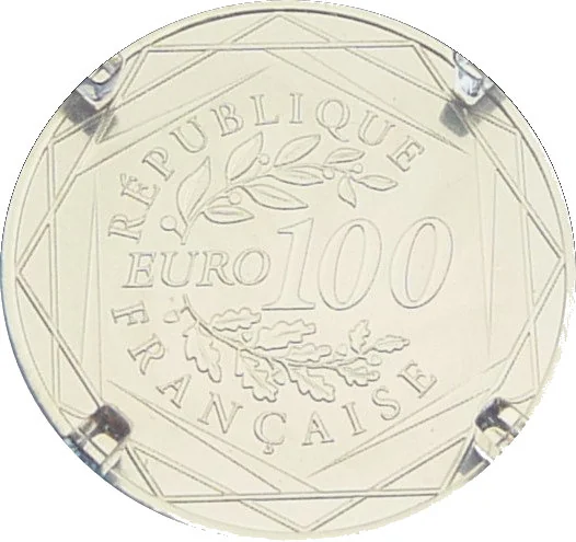 "100 EURO" flanked by laurel and oak branches, encircled by "RÉPUBLIQUE FRANÇAISE" and three hexagons.