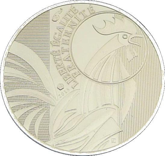 A stylized rooster in profile. Above it, France's motto "LIBERTÉ ÉGALITÉ FRATERNITÉ" arcs along the coin's circle. The background features the French flag in heraldic patterns.