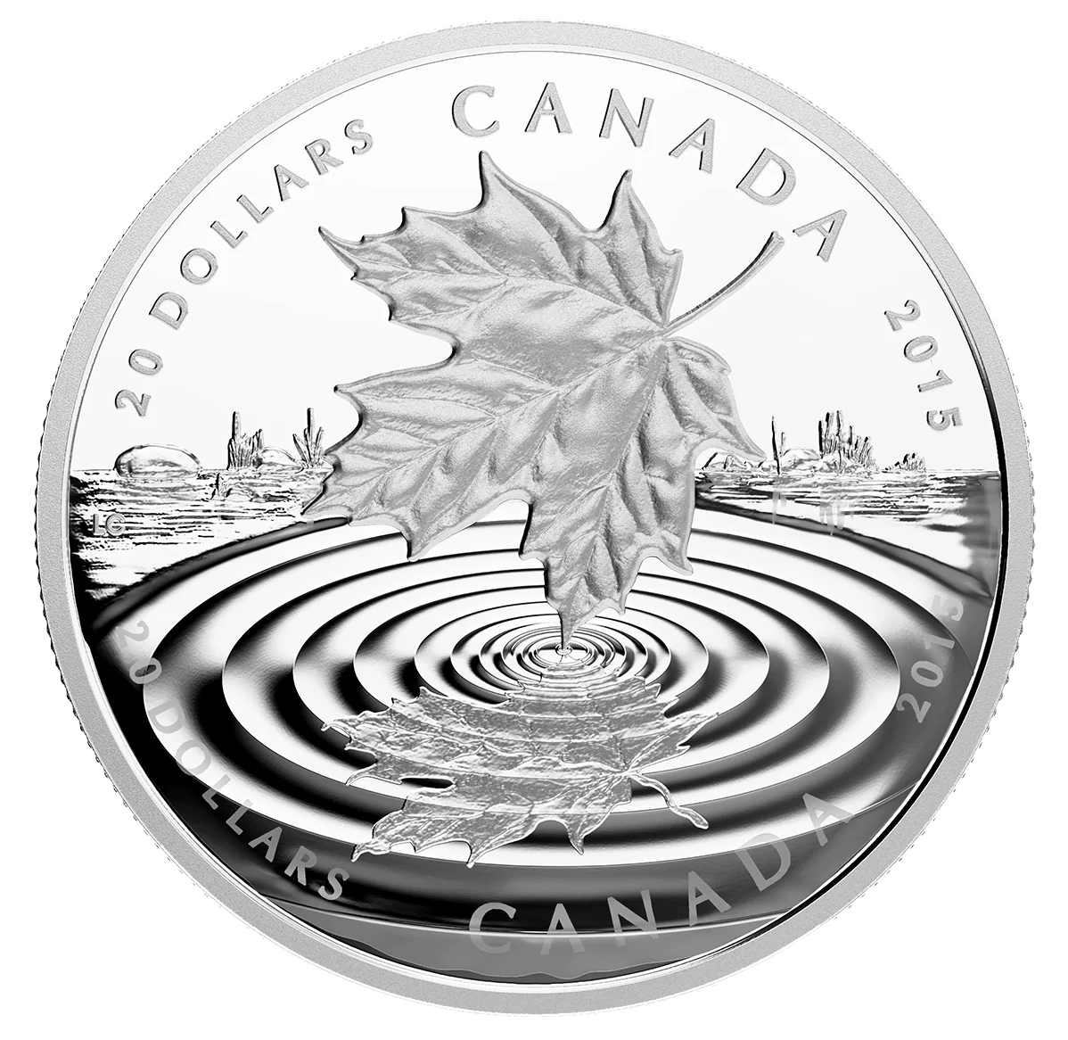 A maple leaf falls onto still water, engraved with traditional and micro techniques, plus laser frosting.