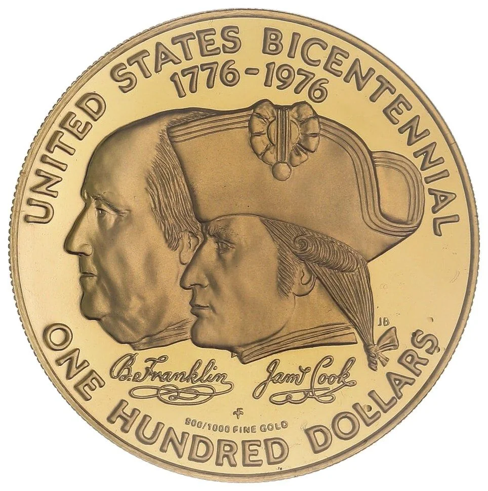 Conjoined busts of Cook and Franklin left of value.
