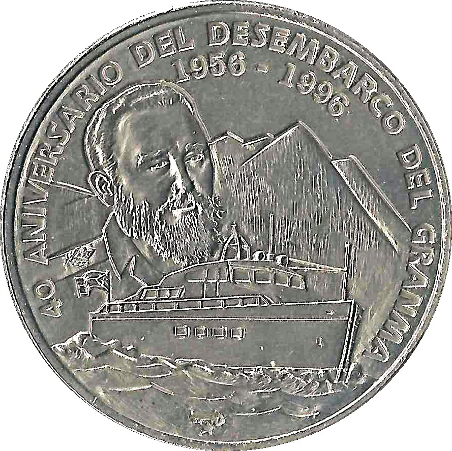 Fidel Castro above Granma yacht, Sierra Maestra shape behind. Event name and dates curve around top and sides; mintmark below.